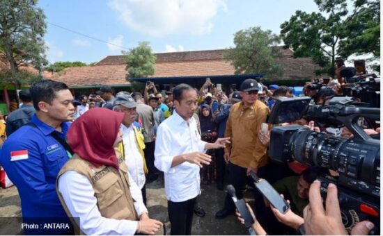 和平日报, 2024年3月23日, 美都新闻网  3 月 22 日电  : 3月22日,佐科威总统视察中爪哇省德马克县一处洪水灾民收容所。总统表示,政府采取措施应对德马克县因极端降雨引发的洪水灾害,包括修复破损的堤坝、消云减雨等。